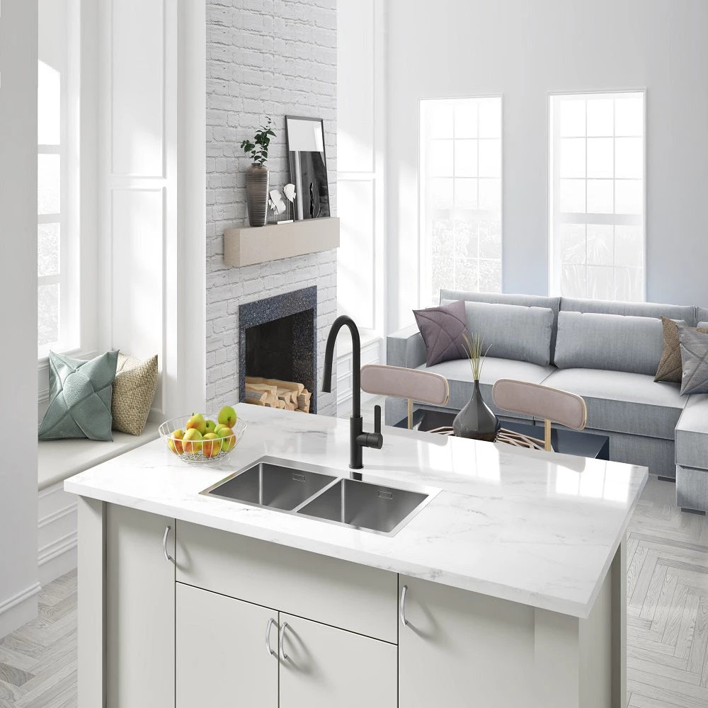 Capture your personality and enhance the appearance of your kitchen with the sleek, modern, and streamlined A-740. The combination of minimalist design and the black finish creates a bold statement that can just as easily blend into the background of any modern kitchen. This approach influences the spray head by departing from the typical bell shape; the cylindrical design creates a seamless, beautiful form. Select spray or stream and tackle any chore that awaits for you in your kitchen.