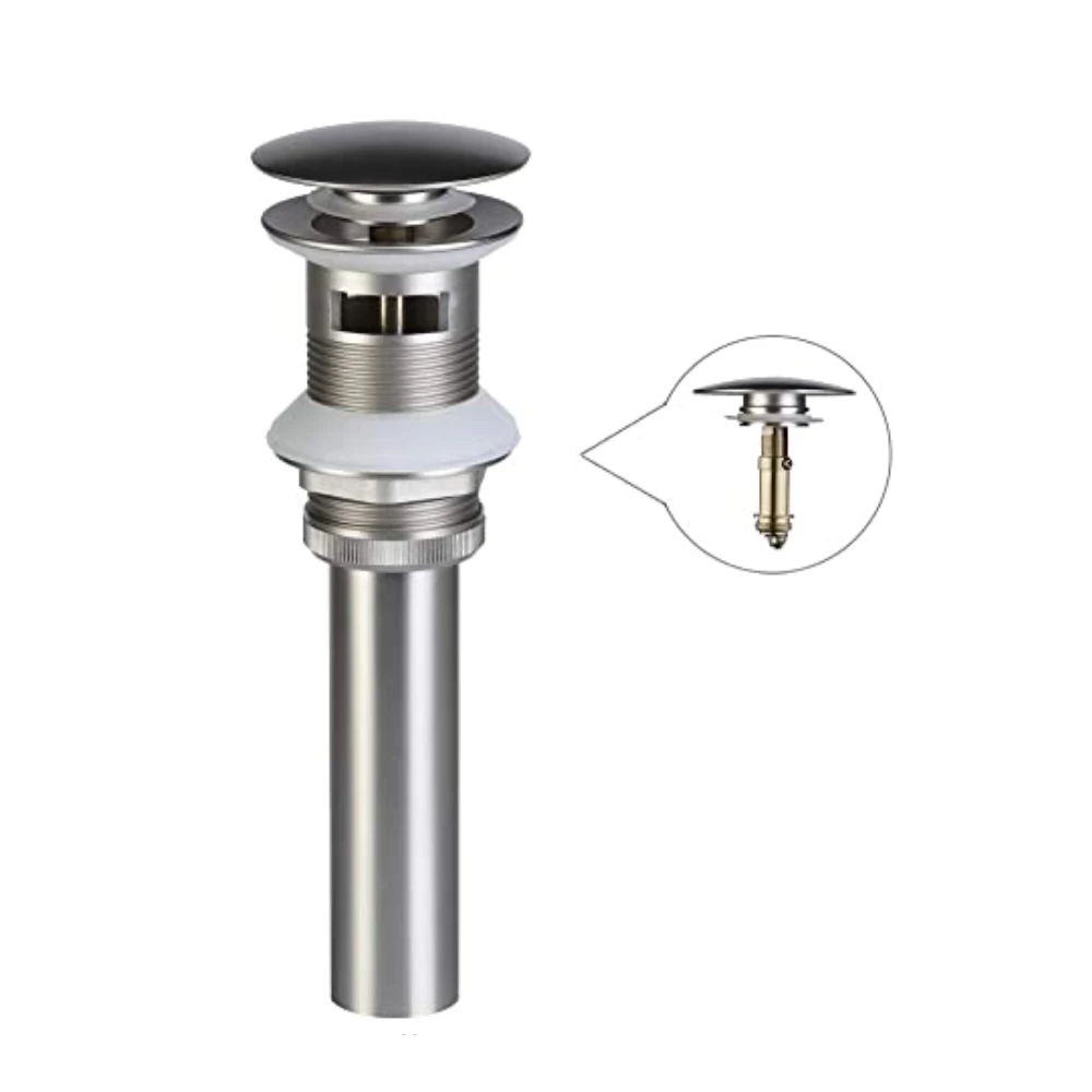 POP UP SINK DRAIN WITH OVERFLOW: This bathroom pop up sink stopper fits vessel or undermount sinks with overflow. Drain Hole Diameter: 1.62-inch to 1.9-inch. Spring loaded push button does not require a lift rod. You can turn the upper cap counterclockwise to unscrew and remove.