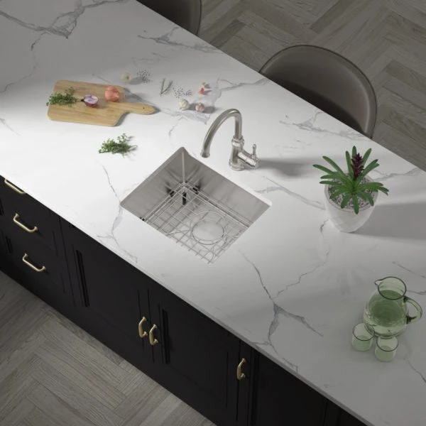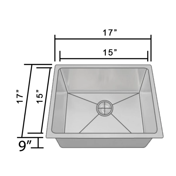 The KH-1717-R15 is an undermount single bowl sink that works perfectly as bar or prep sink, that fits perfectly within an 18″ cabinet. Handmade from 18-gauge 304 stainless steel, the KH-1717-R15 features the bold look of 90-degree corners offering the maximum usable space within the basin. A brushed satin finish protects the beauty of the sink. The dimensions for the KH-1717 are 17″ x 17″ x 9″ with a rear drain that measures 3 1/2″. Every Allora USA sink features a coating of insulating paint and sound dampening pad to reduce noise. Pictures not to scale. Accessories not included.