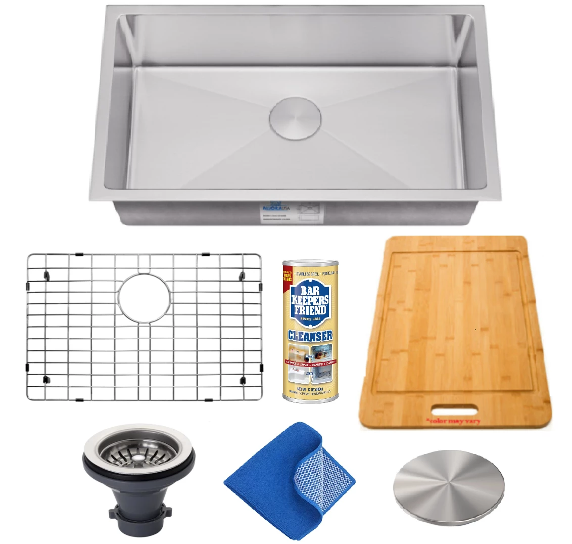 Our kitchen sink combination packages make it easy to save while getting all the accessories you’ll need to get the most out of your new sink. Our combinations include the matching grid or grids, a strainer, and a bamboo cutting board, cleaning kit and drain cover.  Sink combos offer an incredible value over buying each accessory individually, and they reduce the frustration over what accessories you’ll need to install, beautify, and protect your new sink. Shop today and compare the potential savings when you choose to buy a sink combination.