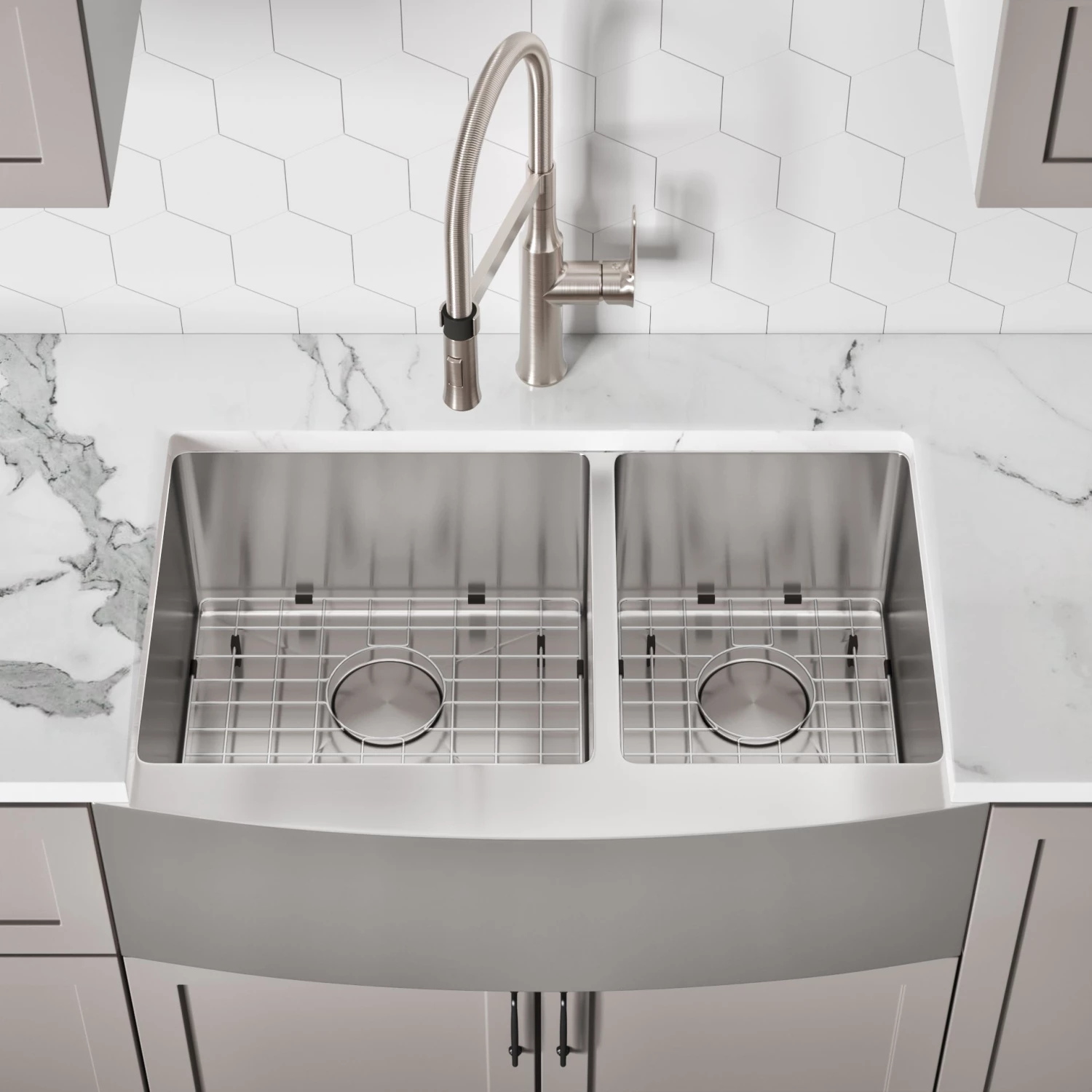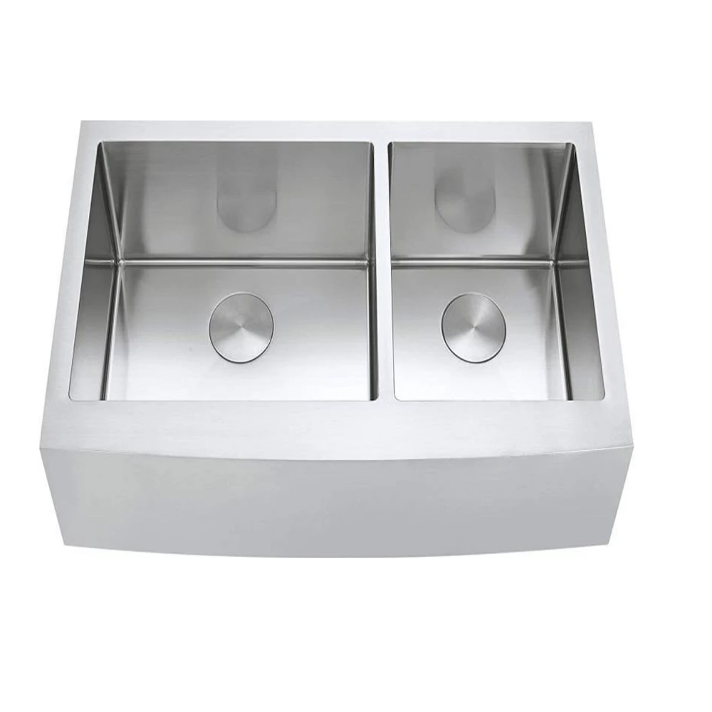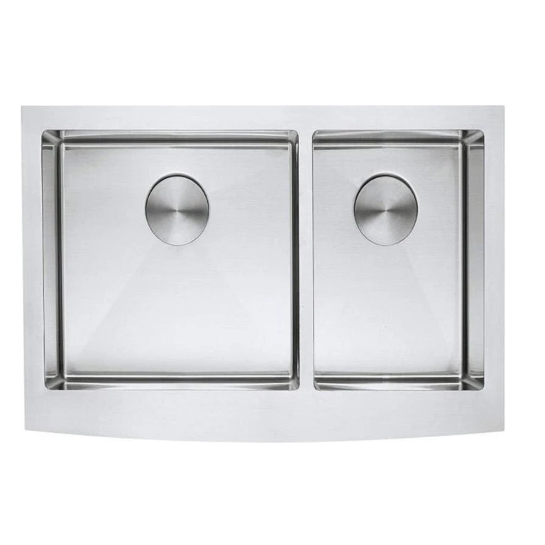 The KH-3321F-D-R15 is a farmhouse double bowl kitchen sink with radius 15 corners and an exposed stainless steel apron. The KH-3321F-D-R15 fits perfectly within a 36″ cabinet. Handmade from 18-gauge 304 stainless steel, the KH-3321F-D-R15 features tight corners and a basin depth of 10-inches. Get the utility and elegance of a zero radius sink with the ease of upkeep offered by tight radius corners. The exposed apron represents the ultimate in kitchen luxury and style. A brushed satin finish protects the beauty of the sink. The dimensions for the KH-3321F-D-R15 are 33″ x 21″ X 10″ and rear drains that measures 3 1/2″. Every Allora USA sink features a coating of insulating paint and sound dampening pad to reduce noise. Pictures not to scale. Accessories not included.