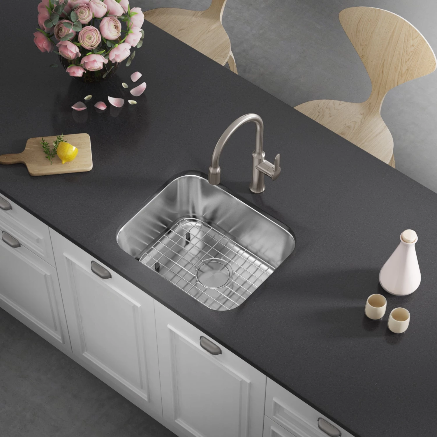 - Padded with undercoated insulation over a rubber pad to reduce noise while the sink is in use
