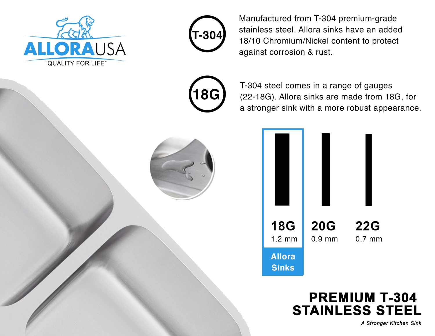 7-inch depth sink takes the frustrating direction of altering your plumbing or cabinet design. We offer these this specialty depth in all of our most popular models, giving you the option of bowl size and configuration. The additional inch of depth over ADA-compliant sinks offers you more usable space while 304 stainless steel and our satin finish ensure timeless beauty and the durability to last a lifetime.