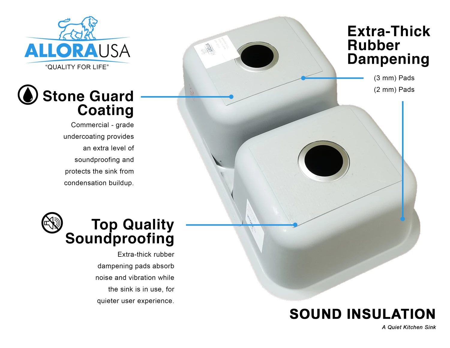- Padded with undercoated insulation over a rubber pad to reduce noise while the sink is in use