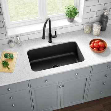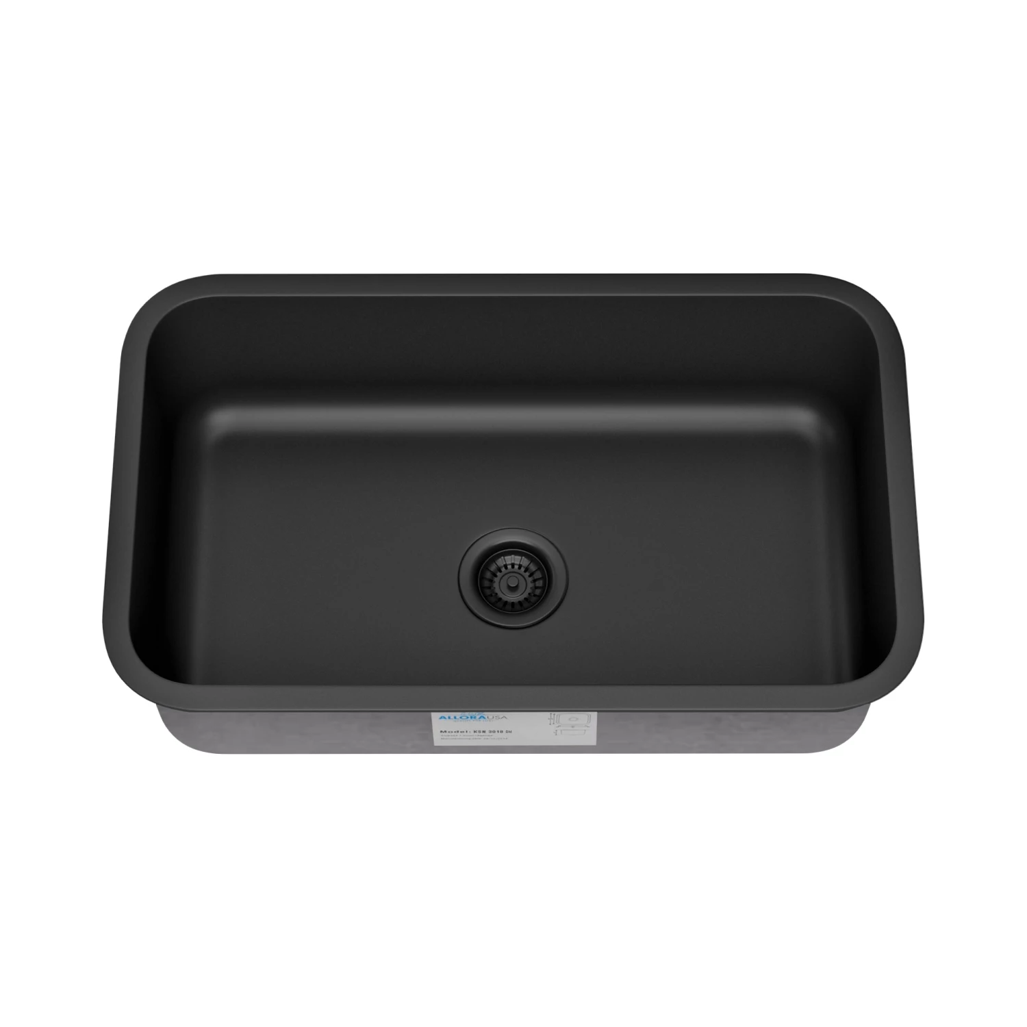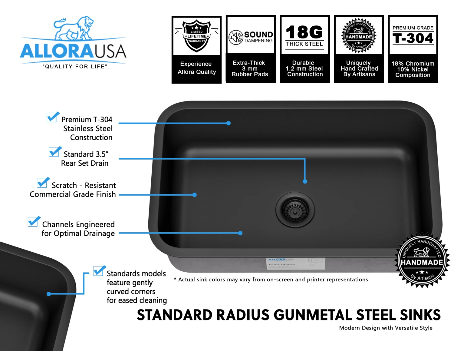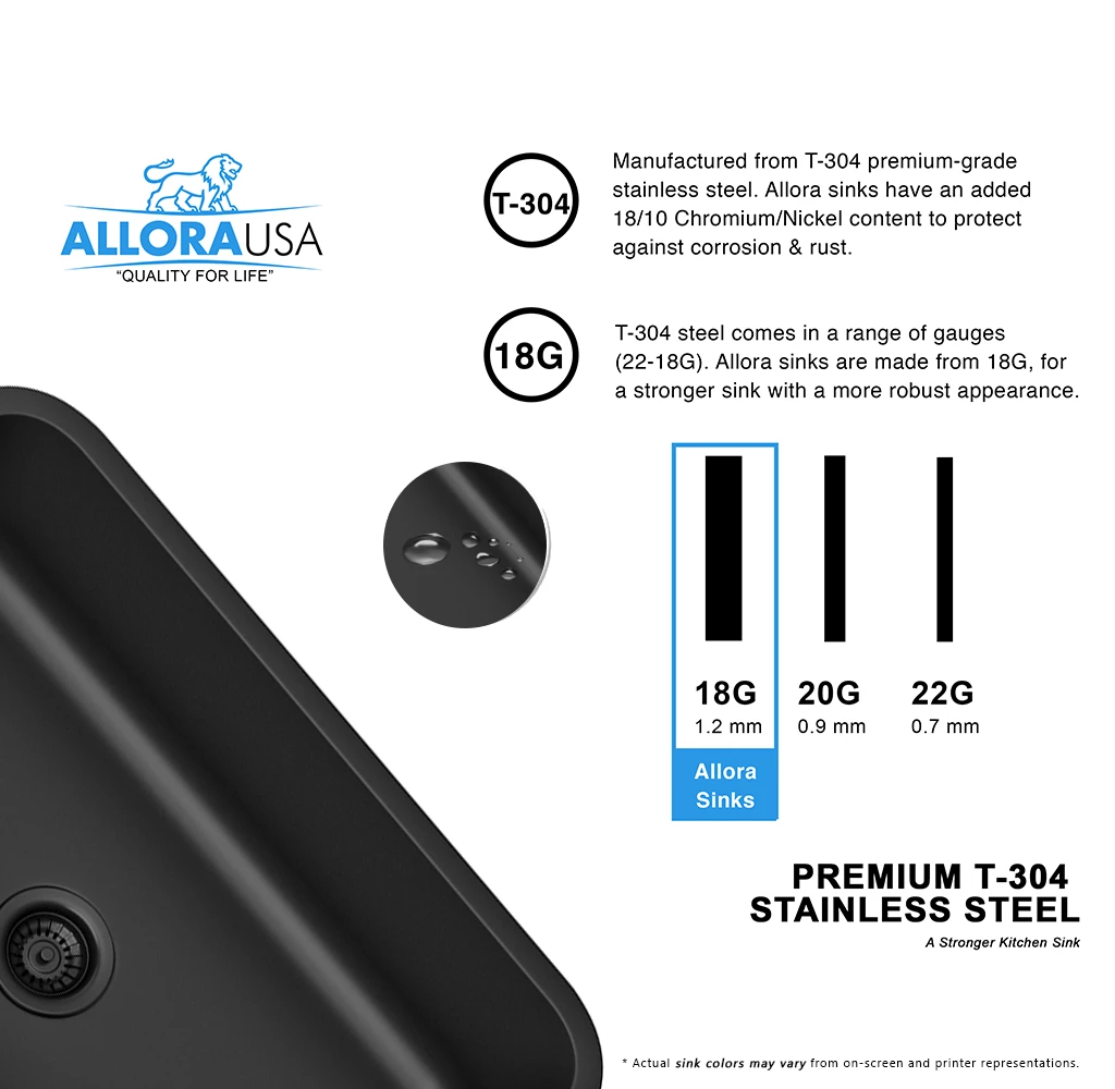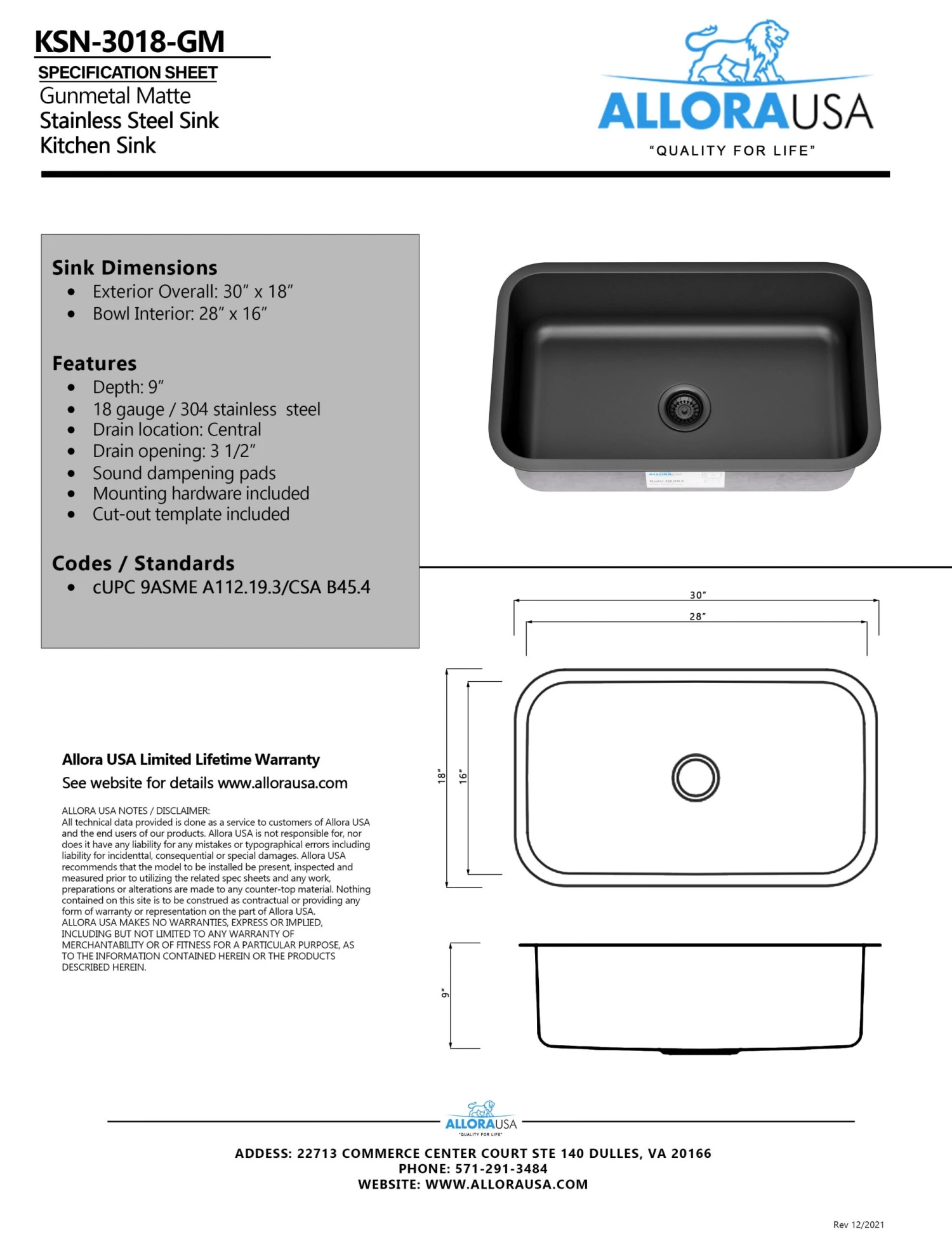 The KSN-3018-GM is an undermount, single bowl kitchen that fits perfectly within a 33″ cabinet. Manufactured from 18-gauge 304 stainless steel, the KSN-3018-GM features a gunmetal satin finish protecting the beauty of the sink. The dimensions for the KSN-3018-GM are 30″ x 18″ x 9″ with a centered drain that measures 3 1/2″. Every Allora USA sink features a coating of insulating paint and sound dampening pad to reduce noise. Pictures not to scale. Accessories not included. Actual sink colors may vary from on-screen and printer representations.