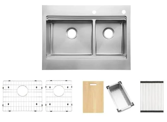SKU: Sinks 6765085884600 Categories: Combo Packs, Farmhouse, Info, Kitchen, Sink Combo, Sinks, Topmount, Undermount Tags: Color Family: Stainless steel, Depth: 8 inch, Gauge: 18, Installation: Undermount, Sink Combo