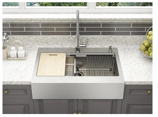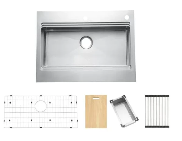 The Blanchard 33 in. Retrofit Workstation Farm Sink with a Single Bowl offers a unique design that allows top mount installation in an existing laminate countertop or as an under mount installation in granite or quartz countertops. This handmade sink is premium 18-Guage stainless steel with a brushed satin finish and R15 corners for cleaning ease. The Blanchard retorfit workstation includes a cutting board, colander, drying rack, sink grids, installation instructions and mounting hardware. Each sink features noise reduction using a sound deadening pad and is fully coated underneath.