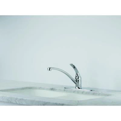 The Delta Foundations Single-Handle Kitchen Faucet in Chrome gives you a practical and hardworking solution that was designed to last a lifetime. With the single-control lever, you can easily adjust both the water flow and temperature. With an elegant, high arc spout that swivels 360 degrees, you have flexibility and greater reach in rinsing food, dishes and the sink.