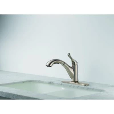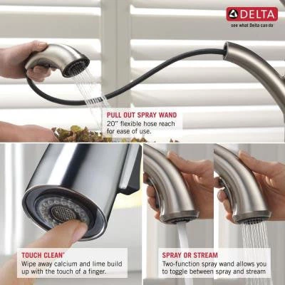 The Delta Grant Single-Handle Pull-Out Sprayer Kitchen Faucet in Stainless is loaded with user-friendly features and has a look that matches any kitchen decor. This faucet is equipped with DIAMOND Seal Technology that reduces the chance of water coming in contact with potential metal contaminants once inside the faucet. This results in cleaner water. In addition, InnoFlex waterways are cross-linked with an electron beam to help eliminate unpleasant odors and taste without chemicals. Touch-Clean soft rubber nubbins enable you to easily wipe away calcium and lime buildup with just the touch of a finger. The construction and functionality give you a faucet that’s built to last up to five million uses. The included escutcheon completes the ensemble for a finished look.
