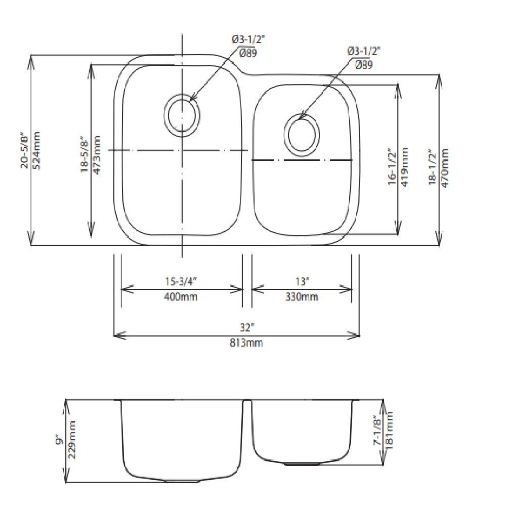 - Sink dimensions: 20-63/100 in. L x 32 in. W x 9 in. D