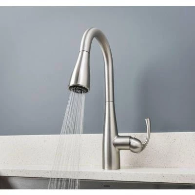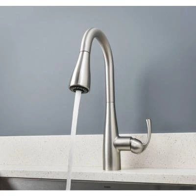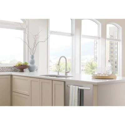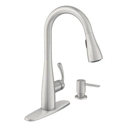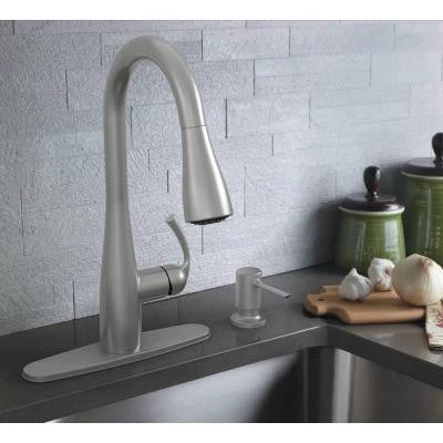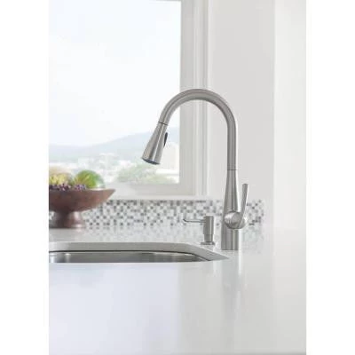 The Essie faucet in Spot Resist Stainless has a single-handle faucet design for quick and easy water control and includes a convenient soap/lotion dispenser. This faucet features a Spot Resist stainless finish to help resist fingerprints and water spots. The 1-handle lever handles make it easy to adjust the water. The transitional styling of the Essie collection offers delicate curves that make any kitchen feel like home.