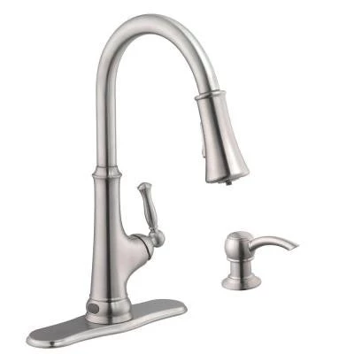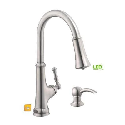 The Glacier Bay Touchless Single-Handle Pull-Down Sprayer Kitchen Faucet with LED Light in Stainless Steel is a faucet that blends innovation with style. The intuitive sensor allows hands free use of the faucet, which is ideal to reduce the spread of bacteria in the kitchen. Simply wave your hand in front of the sensor to start and stop the flow of water. The pull-down spray head features a white LED light that runs off energy generated from the flow of water. The LED provides both an aesthetically pleasing design coupled with a sensible solution for your kitchen needs. Use the LED spray head to ensure your pots and pans are spotless. Easily access your soap with the included matching soap dispenser. This faucet also features a ceramic disk cartridge and limited lifetime warranty.