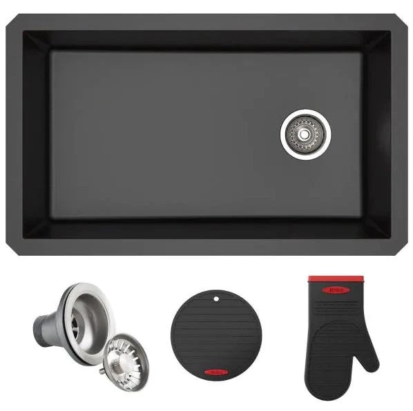 - Kit includes: Forteza series sink, 3.5 drain assembly with strainer, silicone mitt and trivet, mounting hardware, cut-out template, installation and care instructions