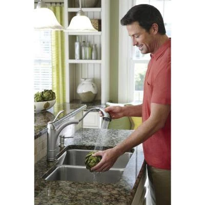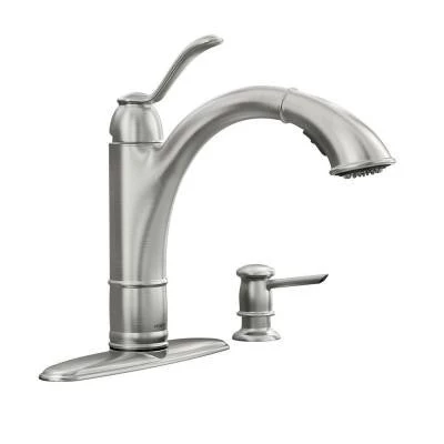 The MOEN Walden Single-Handle Pull-Out Sprayer Kitchen Faucet features a classic traditional style that was inspired by early American country farmhouse fixtures and furnishings. This faucet is equipped with Microban antimicrobial protection to help prevent the growth of damaging bacteria on the finish. It’s complete with an innovative Spot Resist finish to avoid fingerprints and water spots to maintain the brilliance of the original finish and wipe clean with ease. Walden features both the Reflex pull-down system that automatically docks and Power Clean spray technology that provides 50% more spray power.