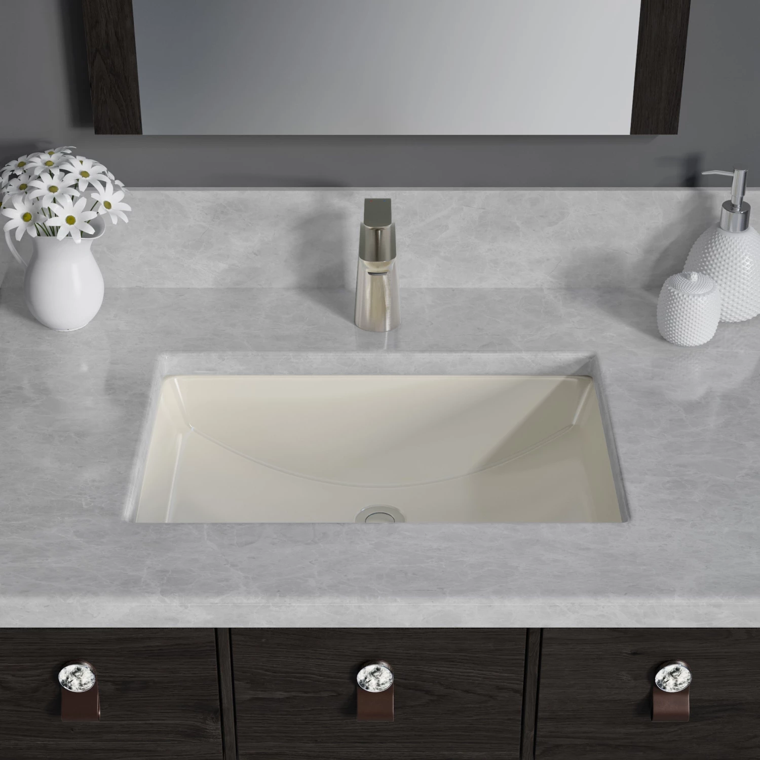 Allora USA offers our rectangle porcelain bathroom sinks in a variety of sizes and colors. These under-mount sinks create a traditional look in your bathroom while providing you with maximum usable space on our countertop. Every Allora USA bathroom sink is manufactured from vitreous china to ensure the durability to last through a lifetime of daily use. Regardless of your preferred size or color finish, we have the perfect sink to compliment your bathroom.